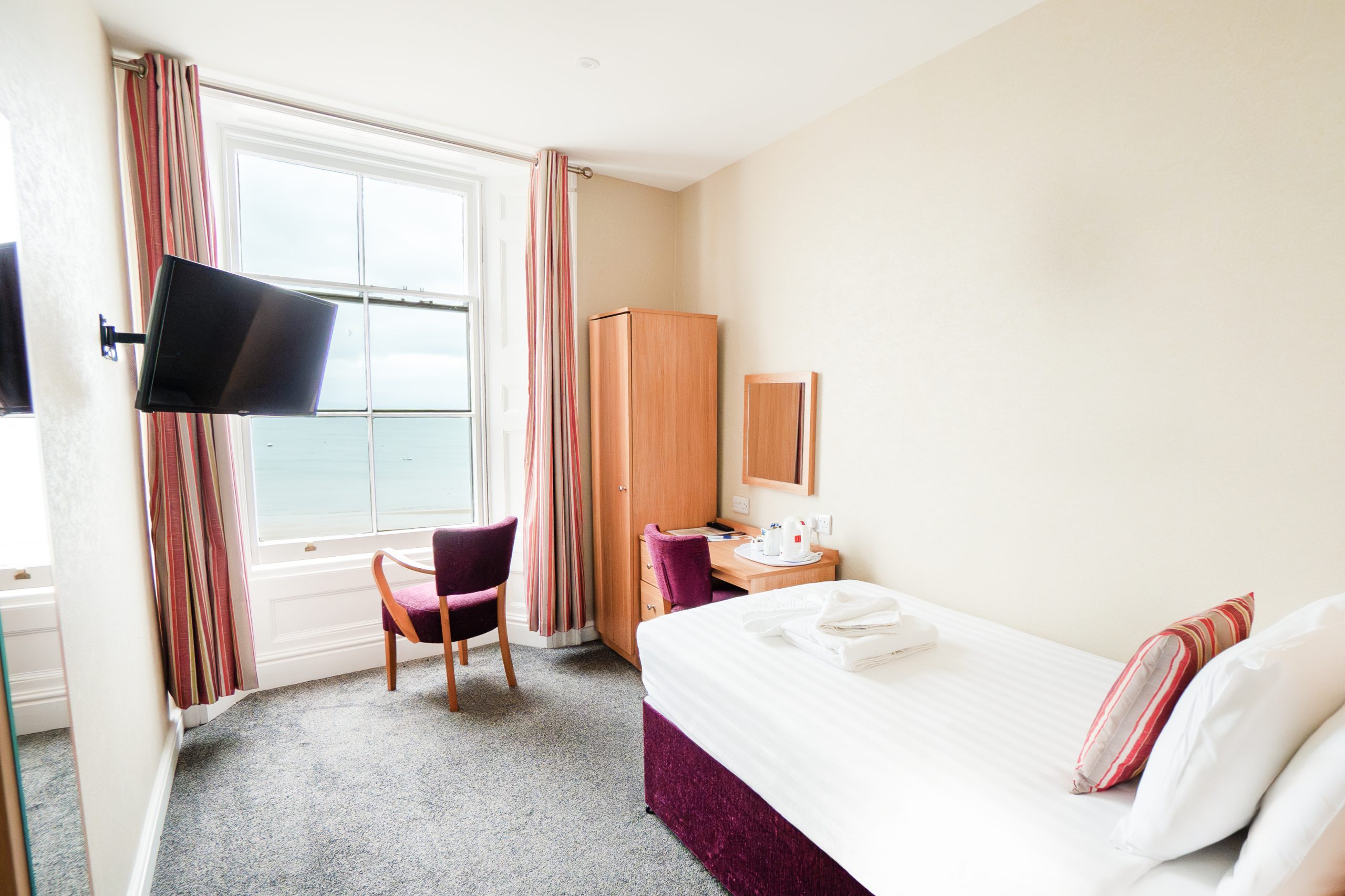 Occupying a prime position on the North Beach, in the stunning resort of Tenby, with its beautiful bay and sparkling crystal clear waters. In the resort you can take a boat trip out to the nearby Caldey Island or relax on the fantastic beach and watch the world go by. The hotel boasts spectacular views across the bay from many of the hotel’s bedrooms and restaurant and is just a short stroll away from the resorts town centre. The hotel features a restaurant, quiet lounge and bar with dancefloor, where you will find entertainment most evenings. Our en-suite bedrooms come with comfy beds for a great nights sleep, tea and coffee making facilities, flat screen TV with Freeview and radio and hairdryer. The hotel has free Wi-Fi throughout and a lift serving 3 floors.