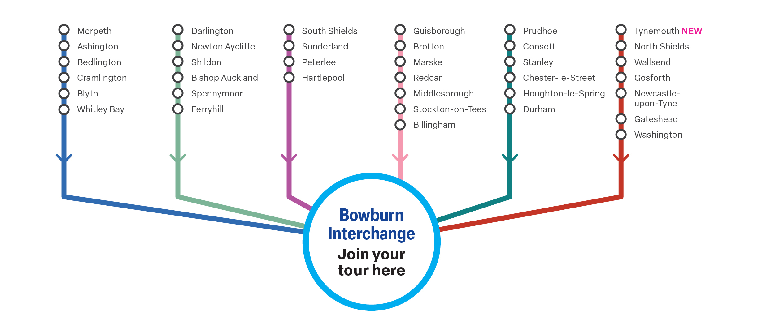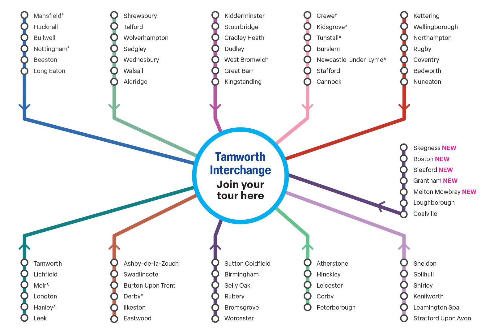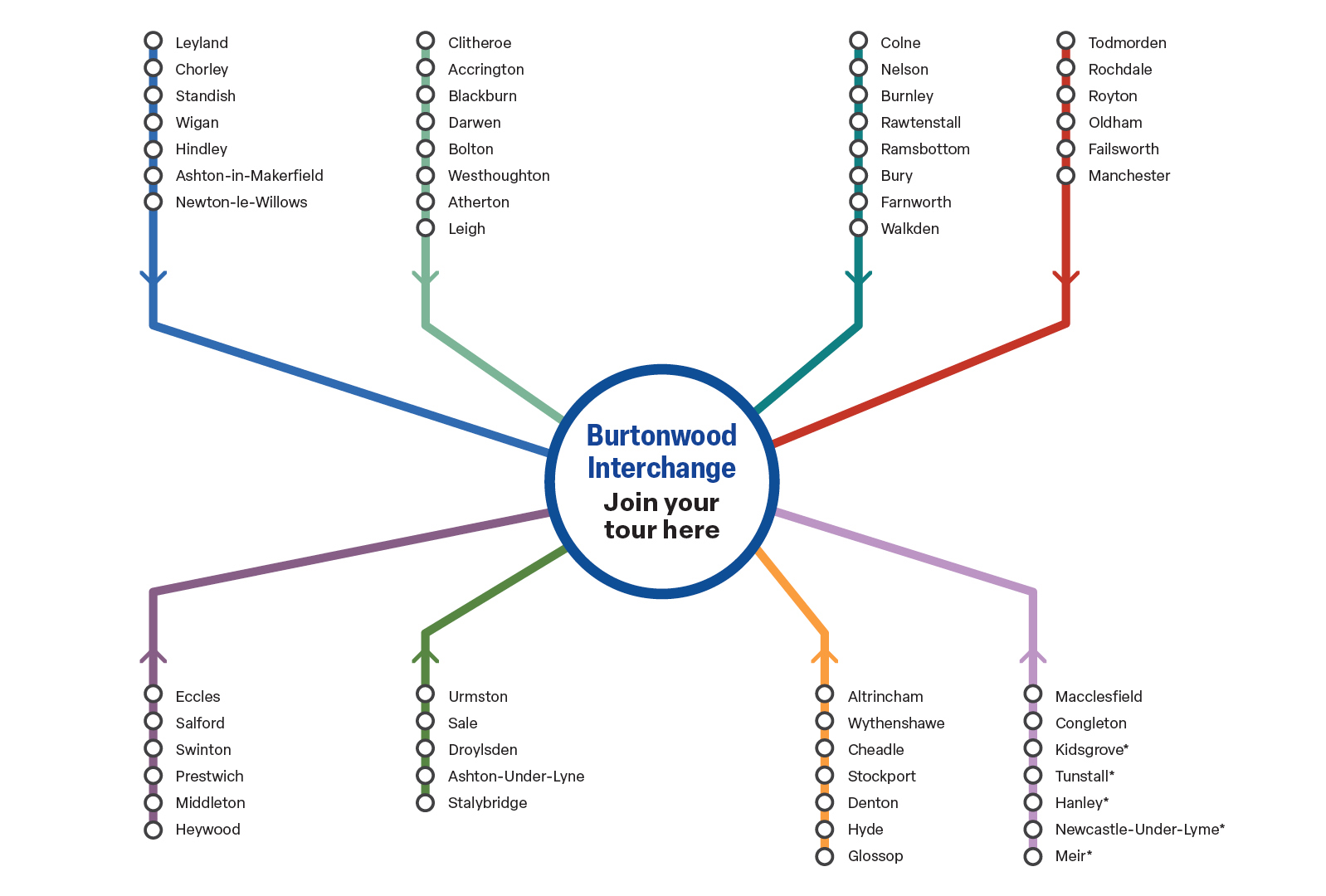^ For customers travelling North from these pick up points, it is recommended that for a shorter journey you use our North West (East) Brochure that interchanges at Burtonwood Services in Warrington.