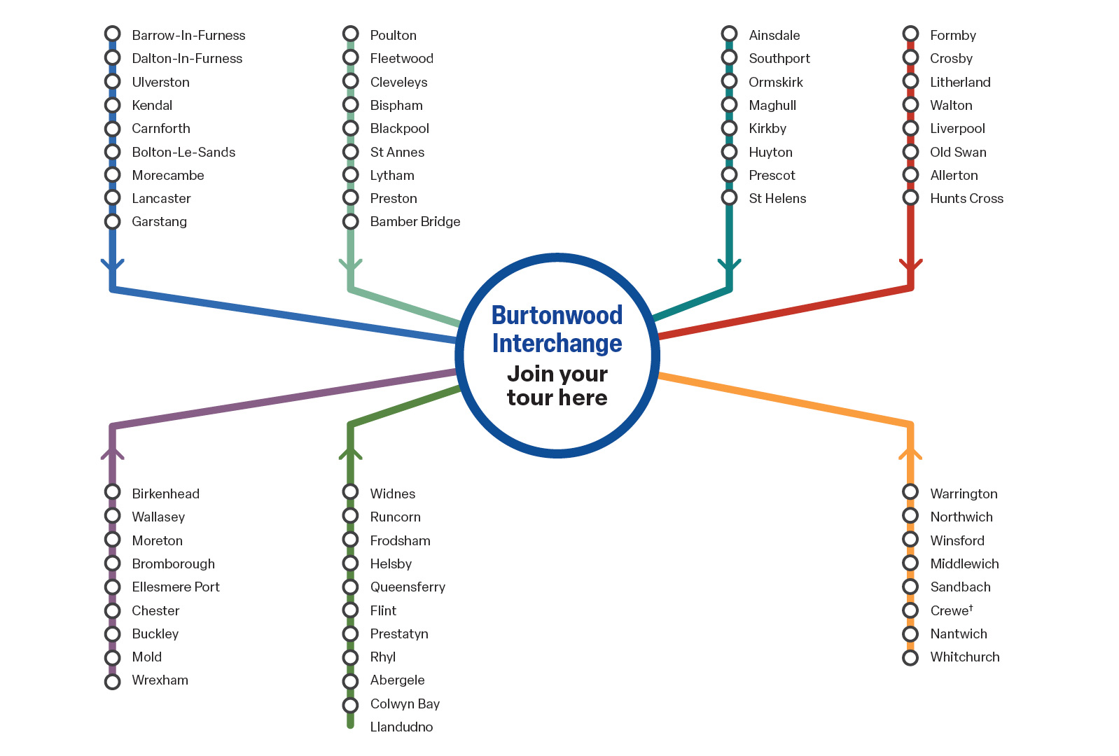 † For customers travelling North from Crew, recommended that for a shorter journey you use our North West (West) Brochure that interchanges at Burtonwood Services in Warrington.
