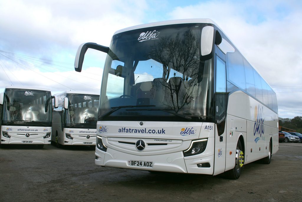 Alfa Travel are pleased to welcome 8 brand new Mercedes-Benz Tourismo Coaches to its fleet. The new additions see the whole Alfa Travel fleet with on-board Wi-Fi installed, so that customers can stay connected when they travel. Alfa Travel’s fleet is also fully Euro VI compliant, the highest environmental standard in the industry.